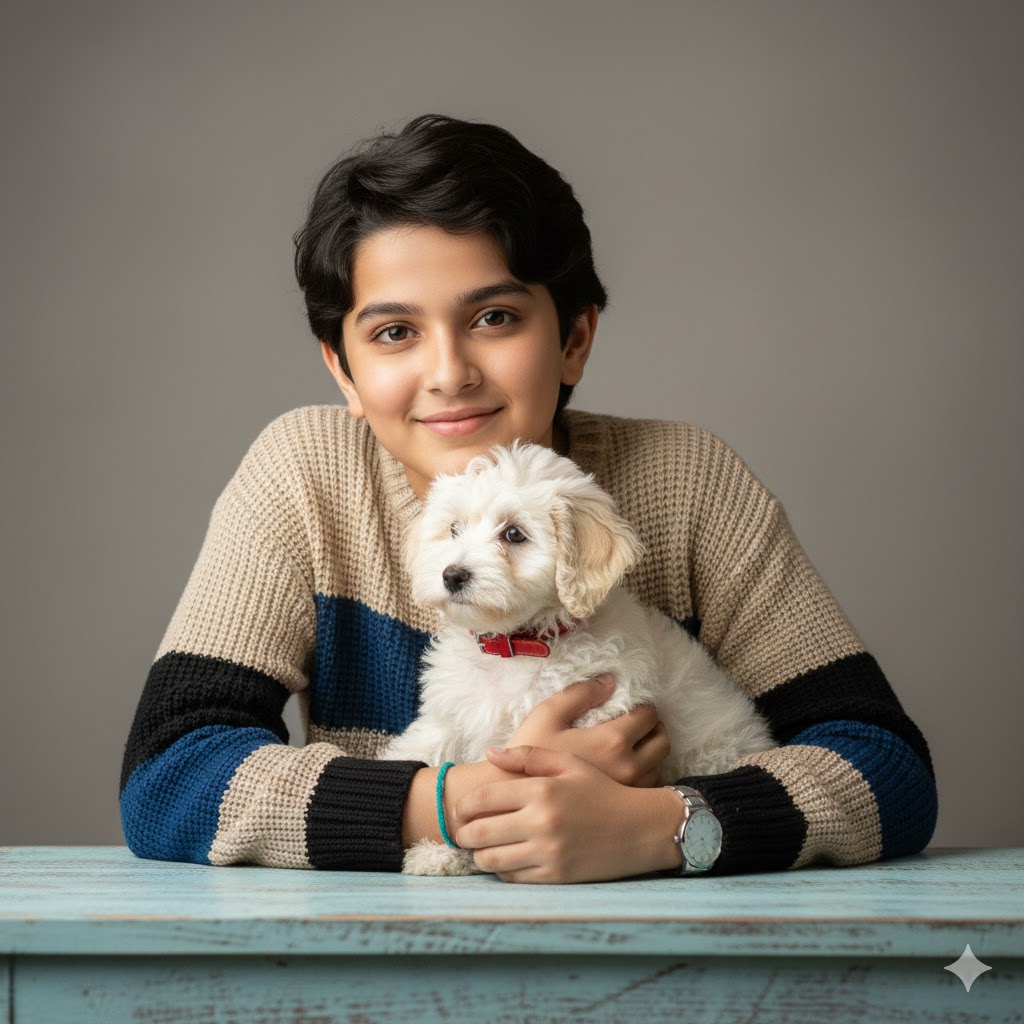 Hyper-realistic 8K studio portrait of a young boy with dark hair and a gentle smile, leaning on a light blue wooden table while holding a fluffy white puppy with a red collar. He wears a color-block knitted sweater (beige, blue, black), silver watch, and turquoise bracelet. Clean grey background, soft professional lighting, detailed fabric and fur texture. Keep the face exactly the same.