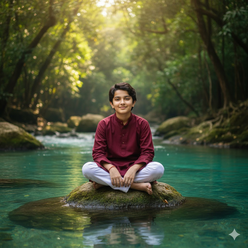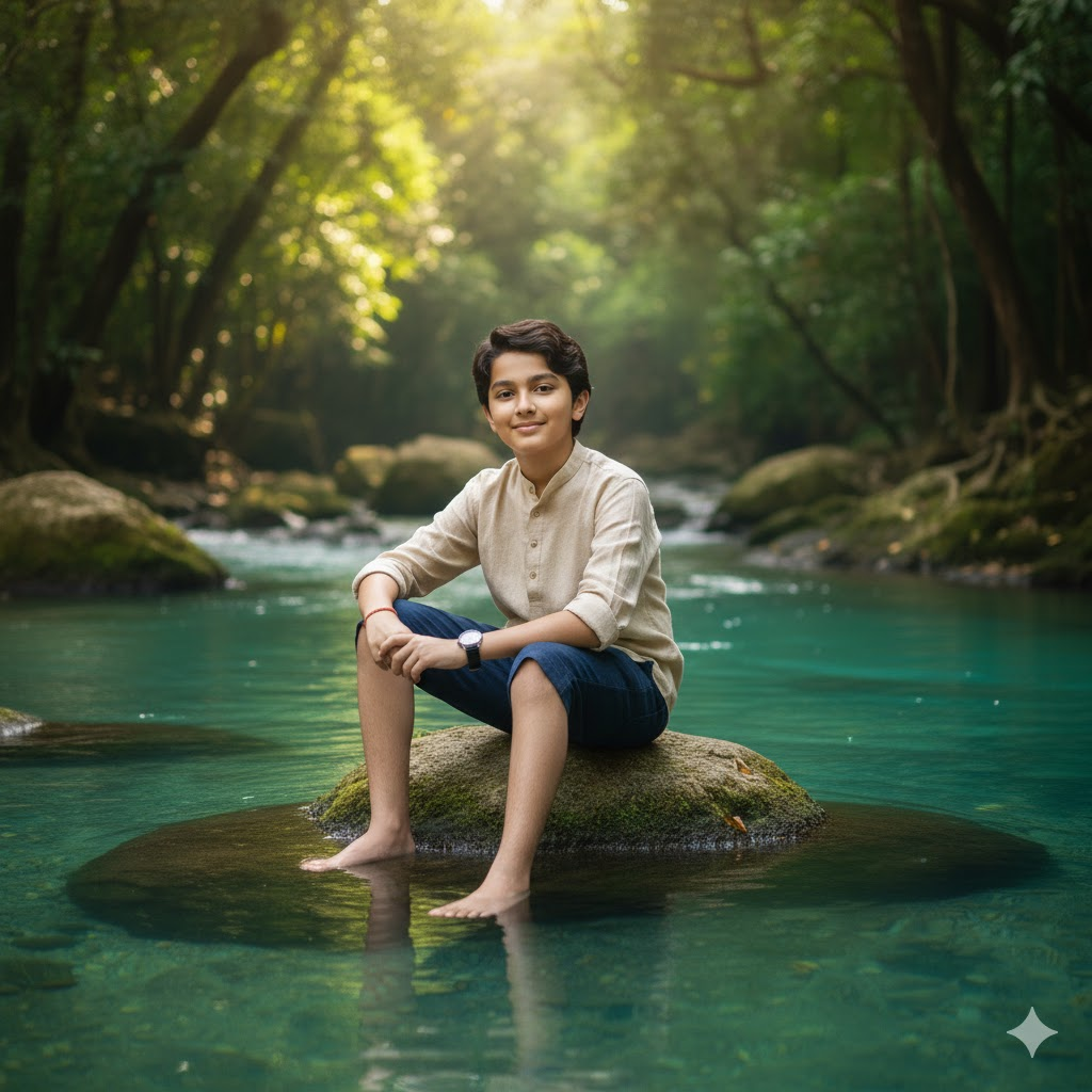Photorealistic full-body 8K portrait of a young boy sitting barefoot on a moss-covered rock in a crystal-clear turquoise river. Wearing a maroon kurta and white pajama, smiling softly. Lush green forest background, sunlight filtering through leaves, calm cinematic mood. Face must remain unchanged.