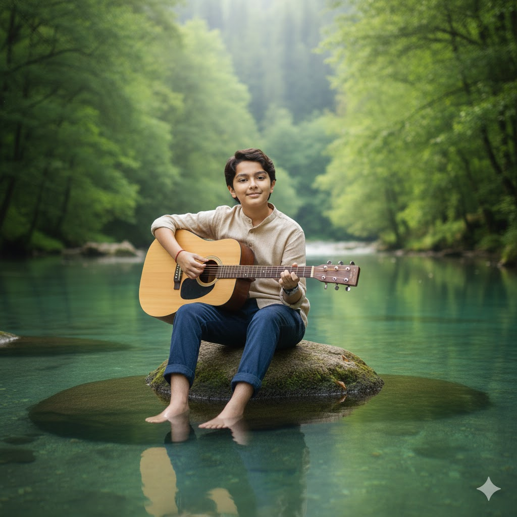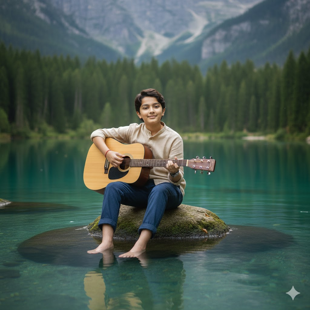 Photorealistic 8K full-body portrait of a young boy sitting on a rock in a calm lake, barefoot, playing an acoustic guitar. Beige linen shirt, dark blue trousers rolled at calves. Pine trees and mountains in background, soft natural light, peaceful cinematic feel. Do not change the face.