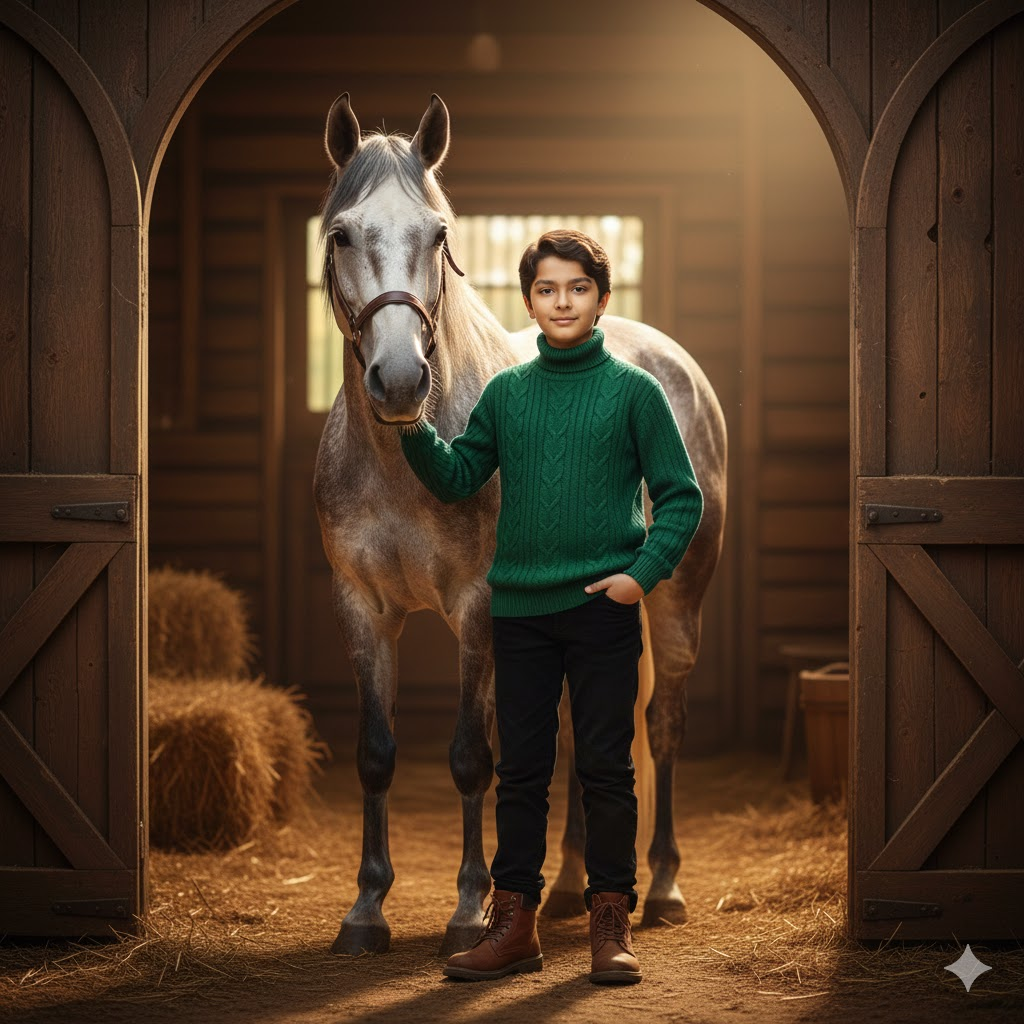 Photorealistic 8K portrait of a young boy standing beside a dapple grey horse inside a rustic barn doorway. Wearing a green cable-knit turtleneck, black trousers, and boots. One hand on the horse, one in pocket. Warm natural barn light, textured wood and hay background. Keep face unchanged.