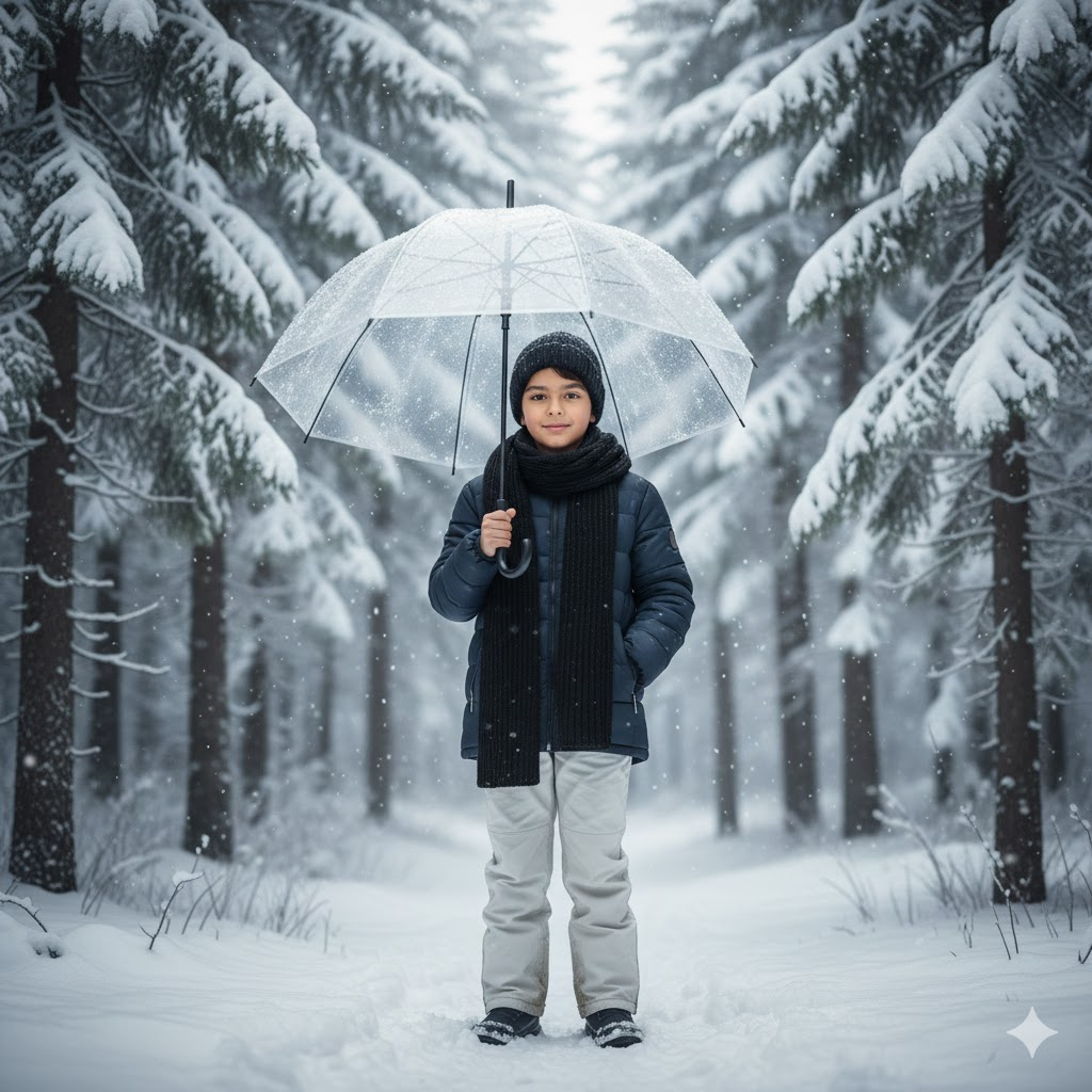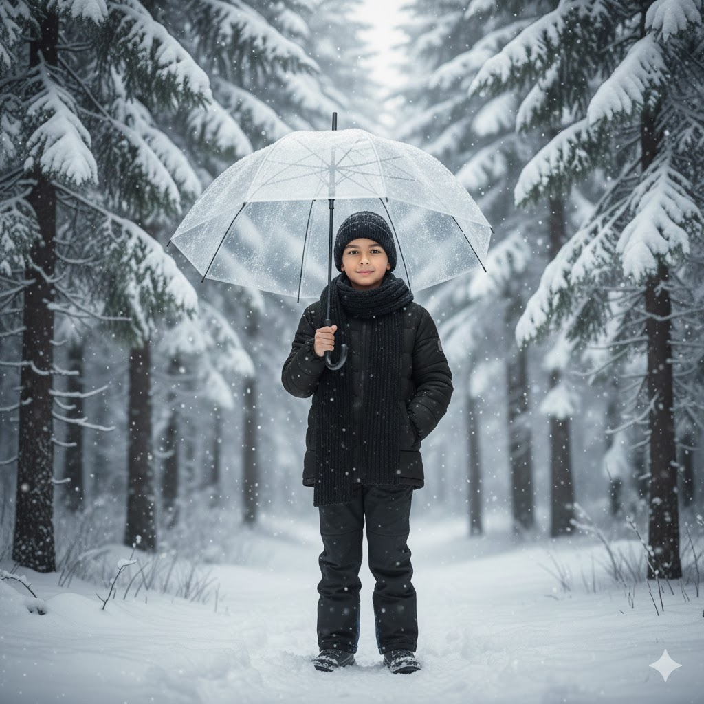 Photorealistic 8K full-body portrait of a young boy in an all-black winter outfit—puffer jacket, snow pants, and scarf—standing in a snow-covered pine forest. Holding a clear umbrella, snow gently falling. Soft lighting, magical winter vibe. Keep the face identical.