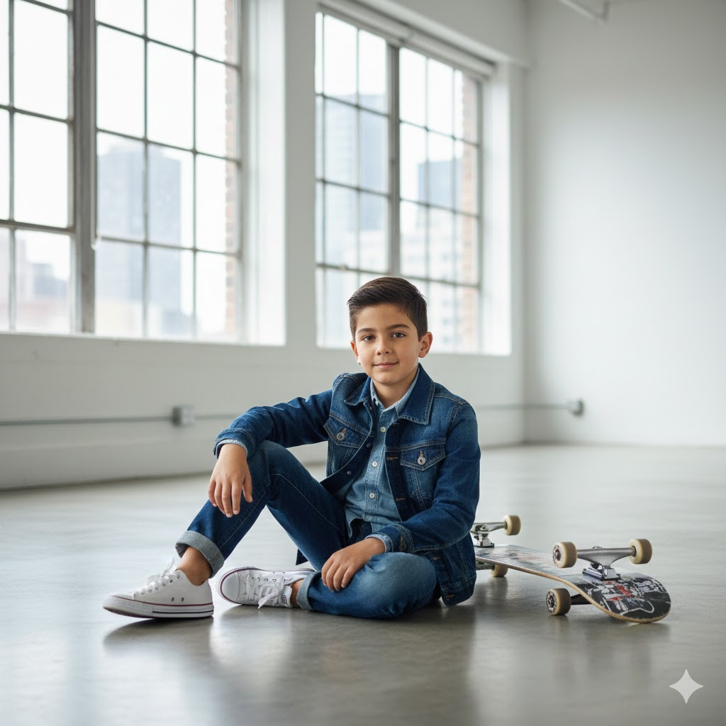 Ultra-realistic 8K portrait of a young boy sitting on a polished concrete floor in a minimalist urban space. Wearing a denim-on-denim outfit with white sneakers. Skateboard beside him. Bright natural light from large windows, modern lifestyle photography look. Face unchanged.