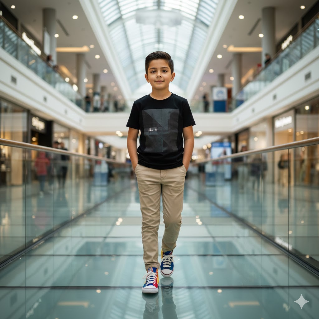 Photorealistic 8K full-body fashion portrait of a young boy walking confidently along a glass walkway in a modern shopping mall. Wearing a black graphic t-shirt, beige pants, and colorful sneakers. One hand in pocket, blurred mall background, fashion editorial lighting. Do not change the face.