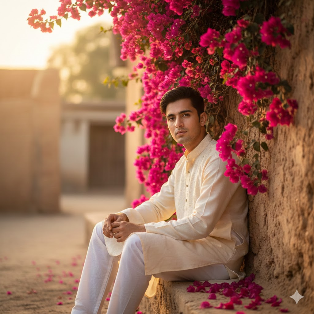Ultra-realistic 8K portrait of a young man using the uploaded face with 100% accuracy. He is seated beside a rural mud wall covered with deep magenta bougainvillea flowers and scattered pink petals. Wearing a cream kurta and white pajama. Soft golden-hour sunlight from the upper left creates gentle highlights and natural shadows. 85mm portrait lens, creamy bokeh, cinematic village mood, highly detailed textures, premium photography quality.