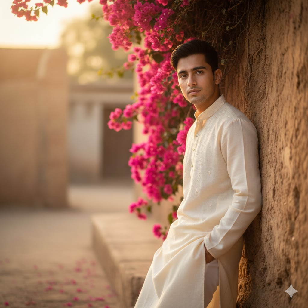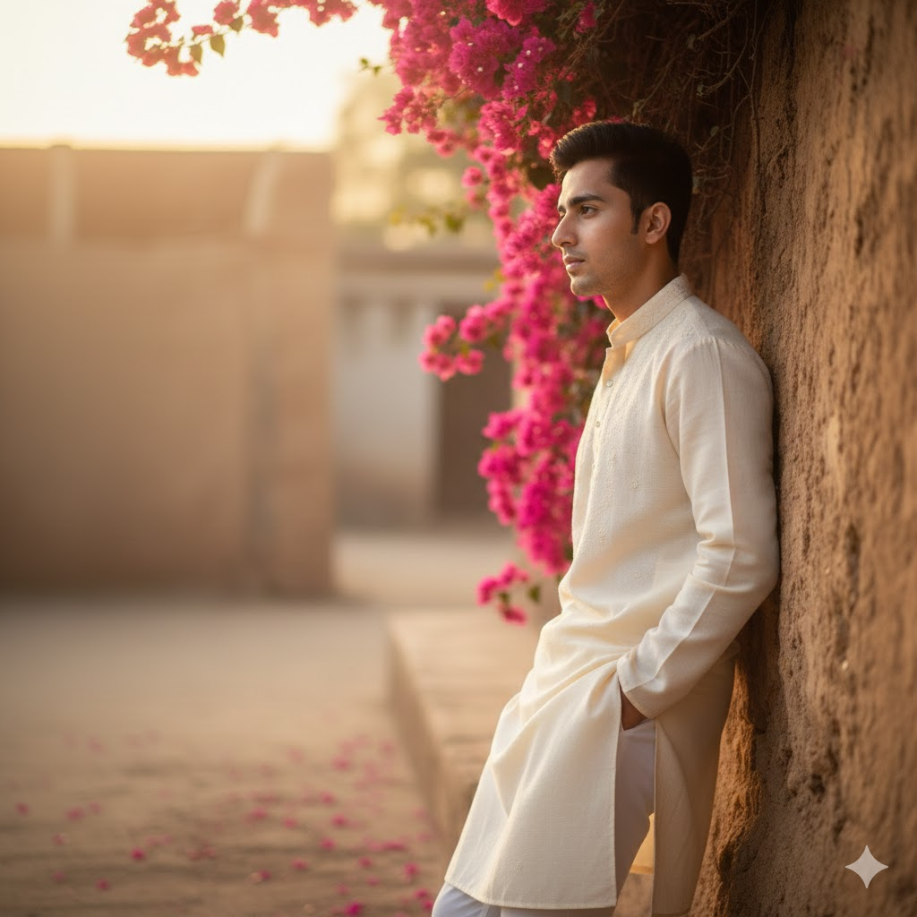 “Portrait of a young man, hyper-realistic aesthetic, cream kurta, rural mud wall background, soft golden-hour lighting, 4K ultra-realistic, DSLR photography.”