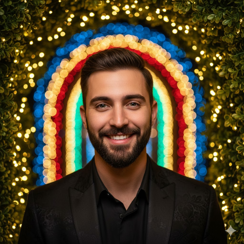 “Vivid mid-shot portrait of a young man with a charming smile and neatly styled beard, looking directly at the viewer through dense green leaves decorated with warm string lights.