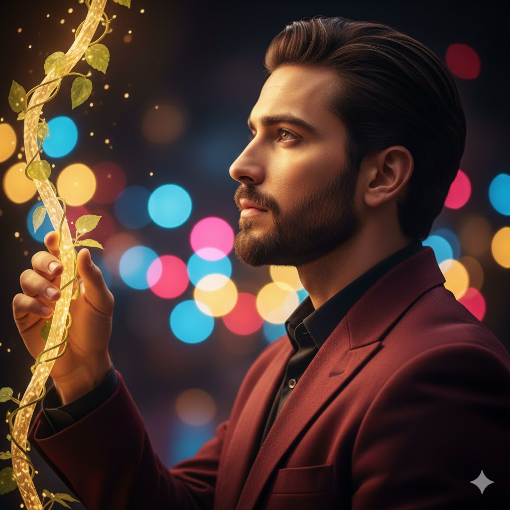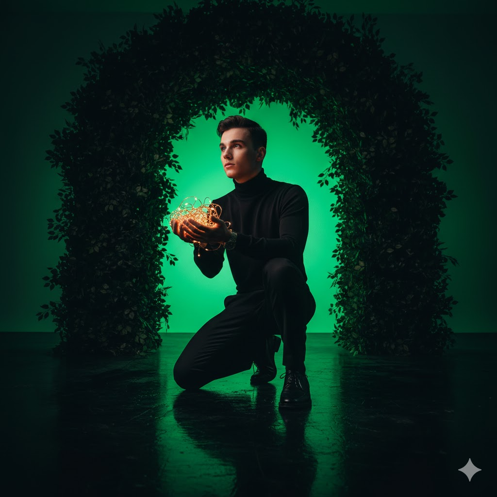 Pose: Kneeling on a reflective floor, gazing at warm glowing string lights in his hands.