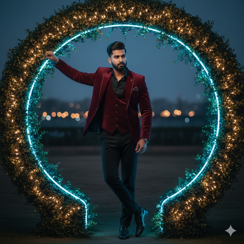 Pose: Leaning casually against a decorative arch wrapped with warm lights and greenery, with a neon-blue inner glow.