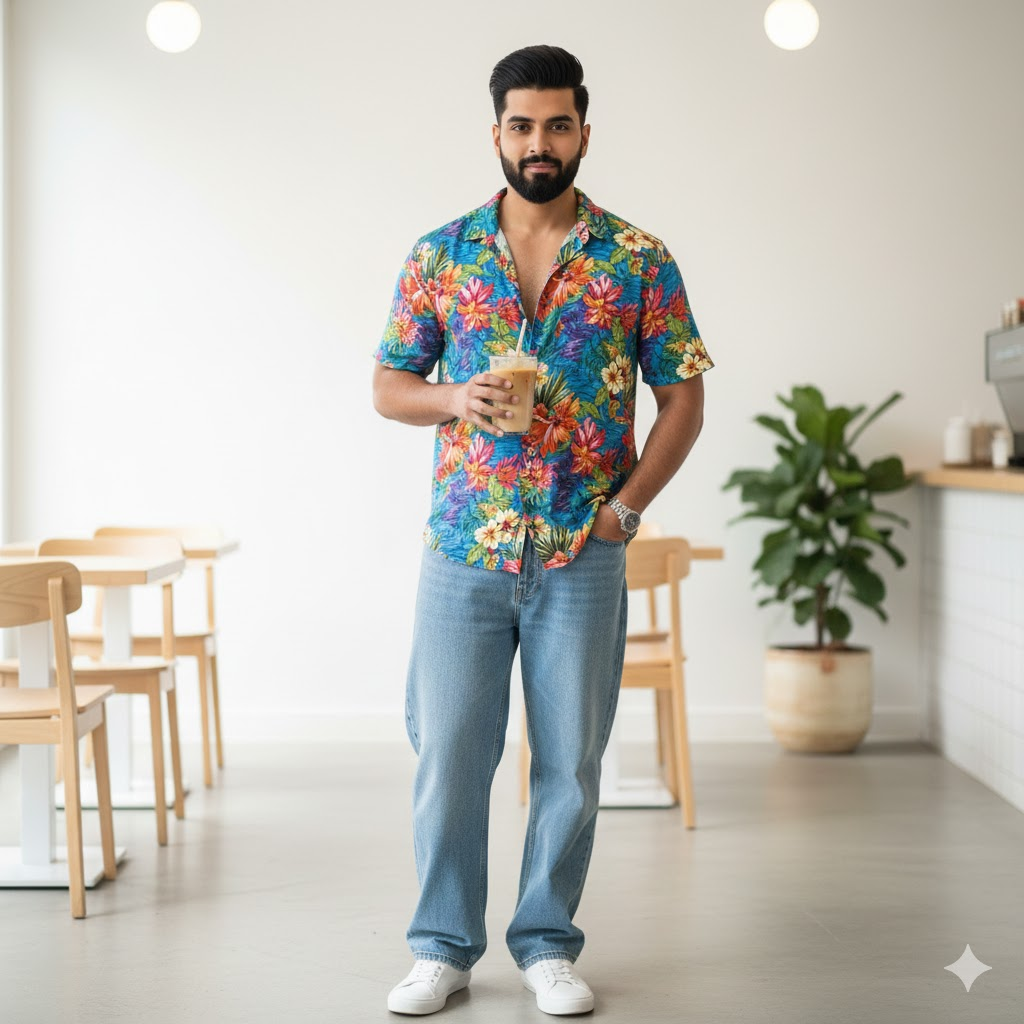 Outfit: Colorful Hawaiian printed shirt with loose blue jeans.