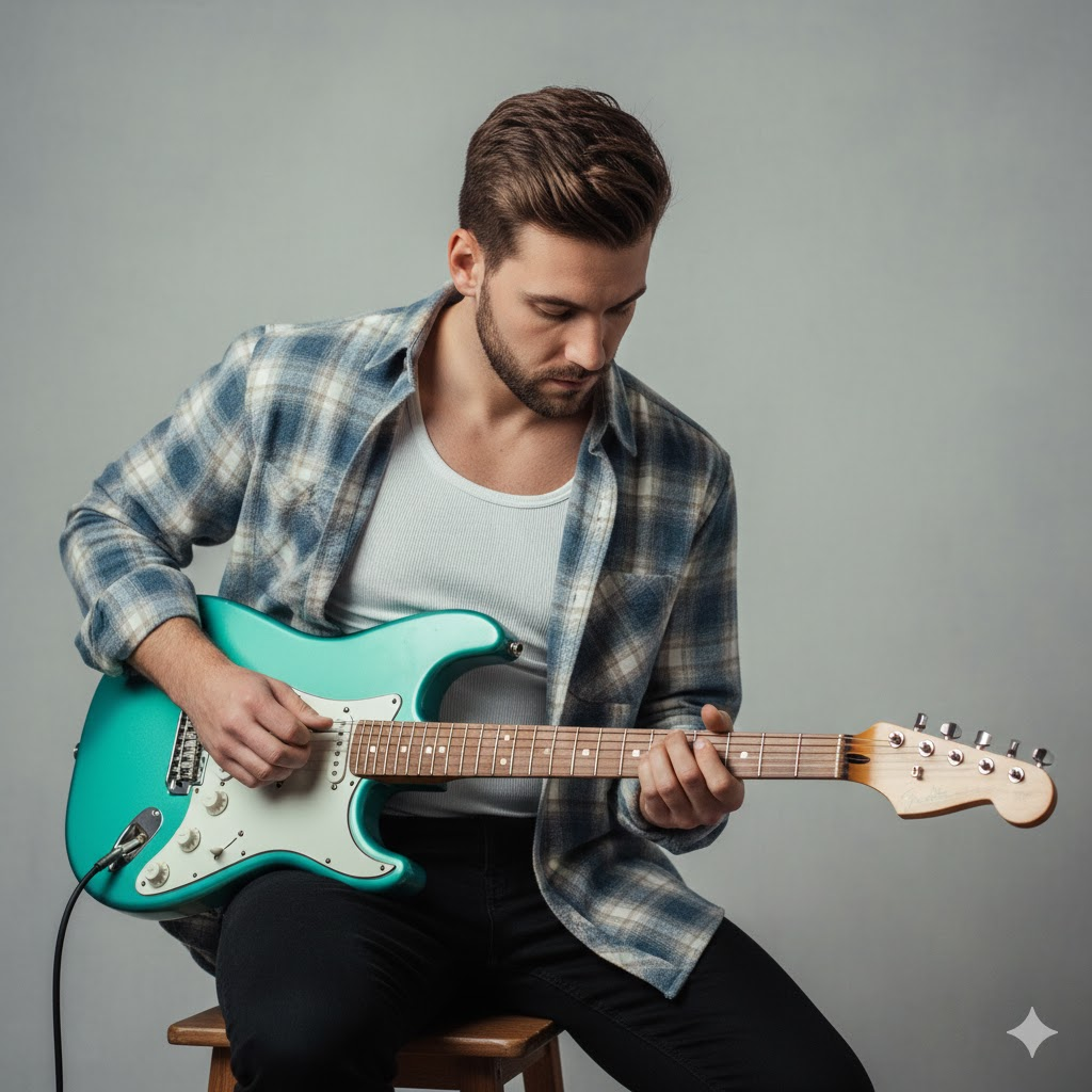 Pose: Sitting on wooden stool playing a teal electric guitar.