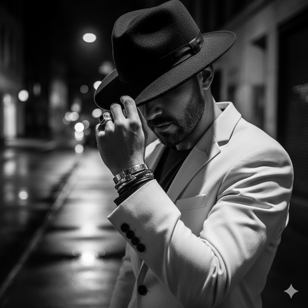 “8K black-and-white editorial portrait of a man in an ivory blazer and forward-tilted fedora casting shadow over his eyes.