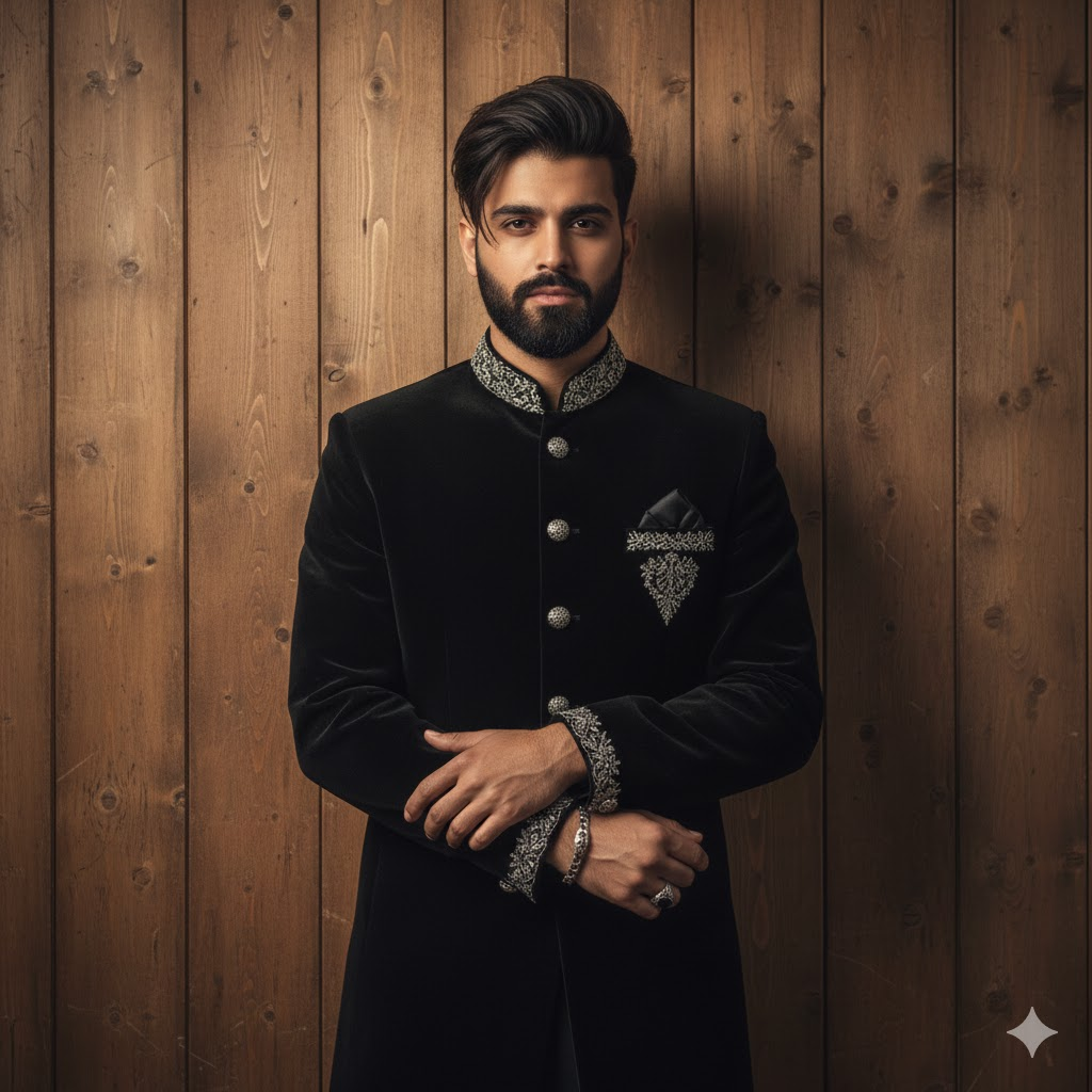“Three-quarter profile portrait of a young man with slick-back hair and a refined beard wearing a maroon velvet suit.