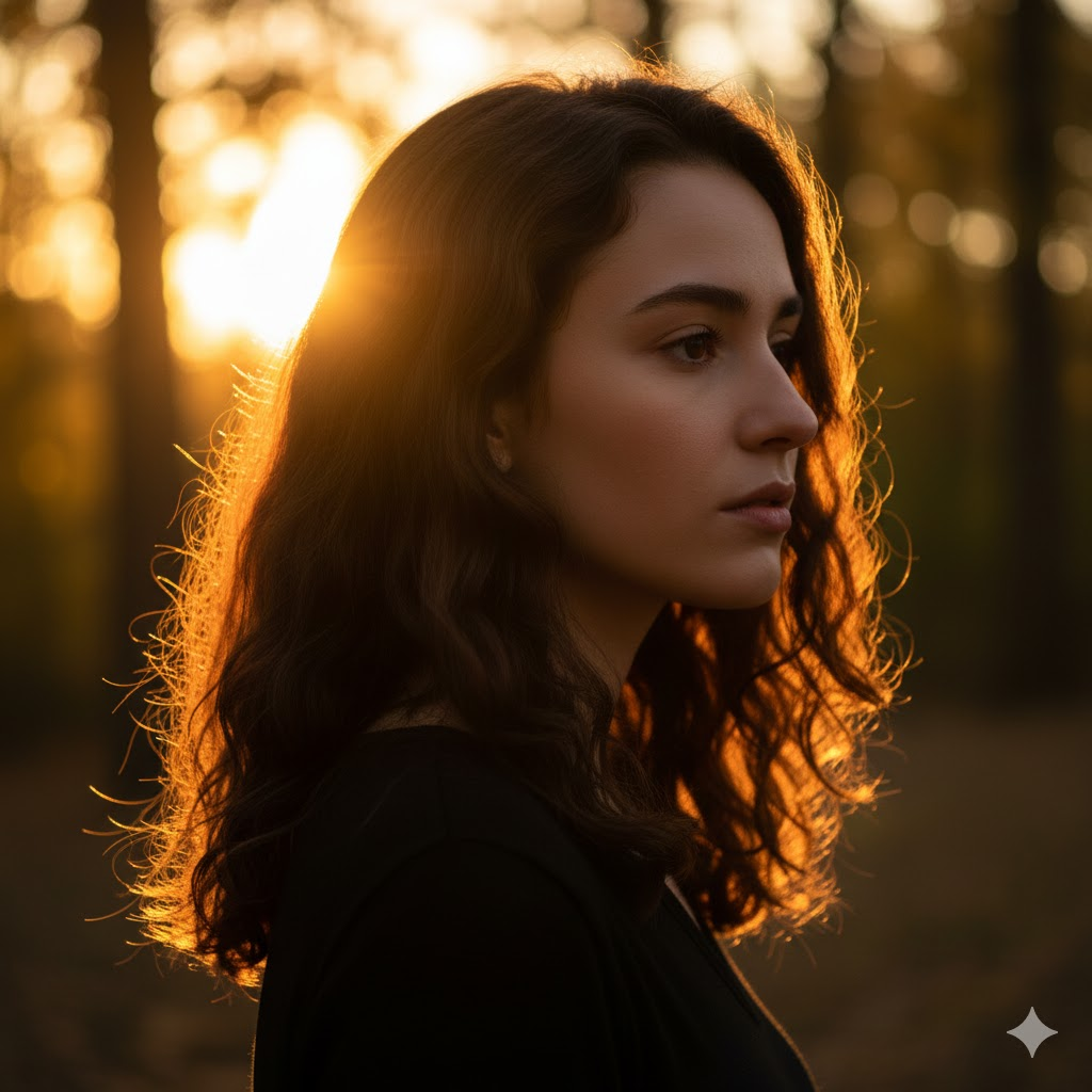 “An expressive portrait bathed in directional golden hour light with vibrant rim lighting…