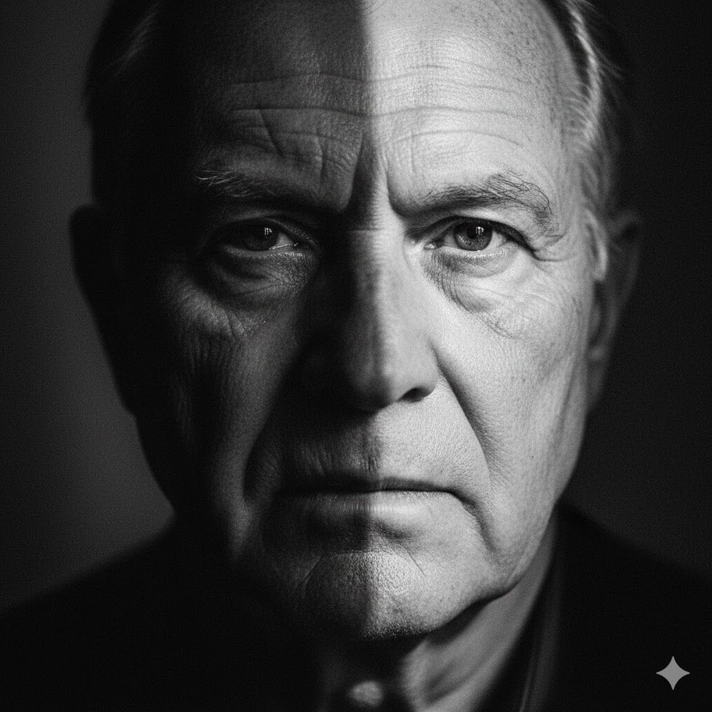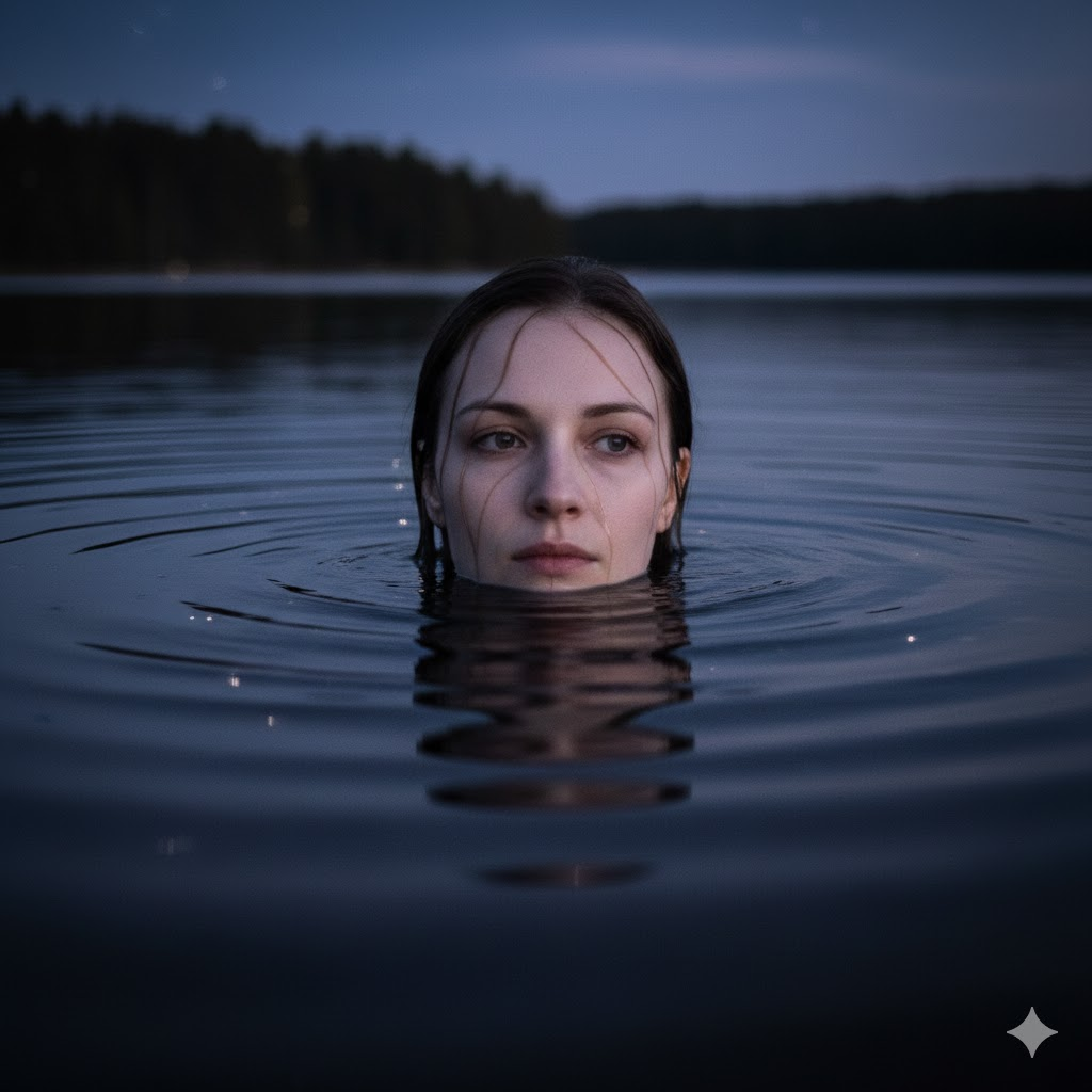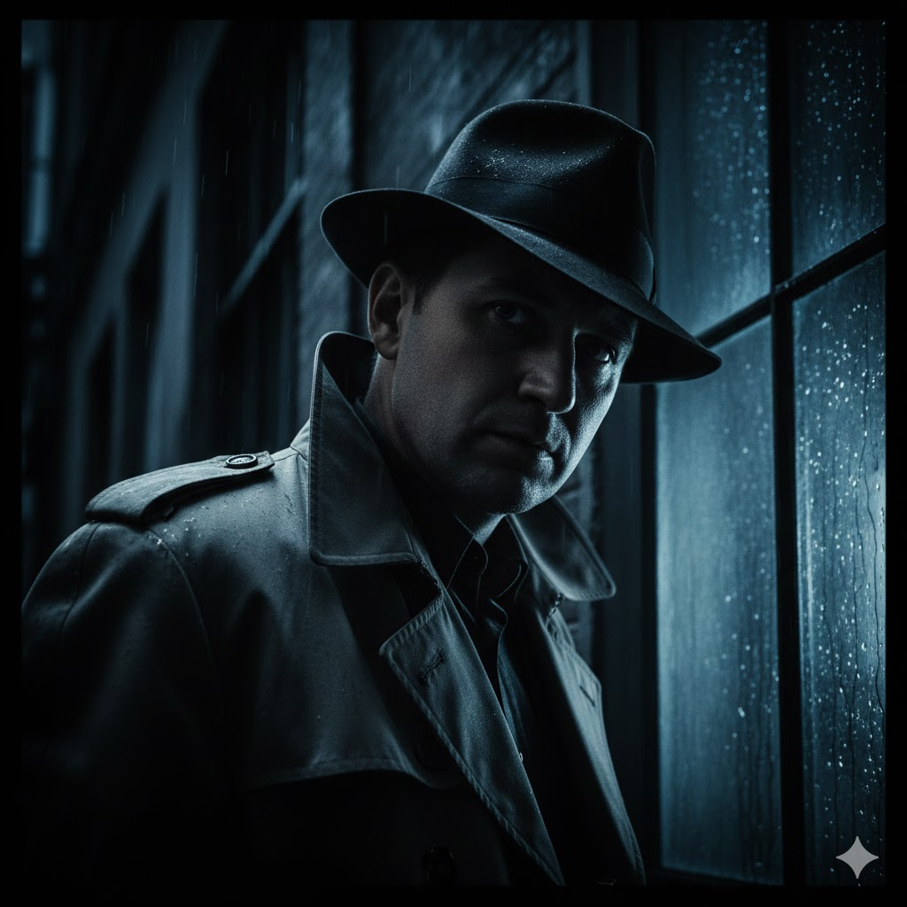 A psychological, noir-inspired portrait using a tilted frame and cold blue side lighting.