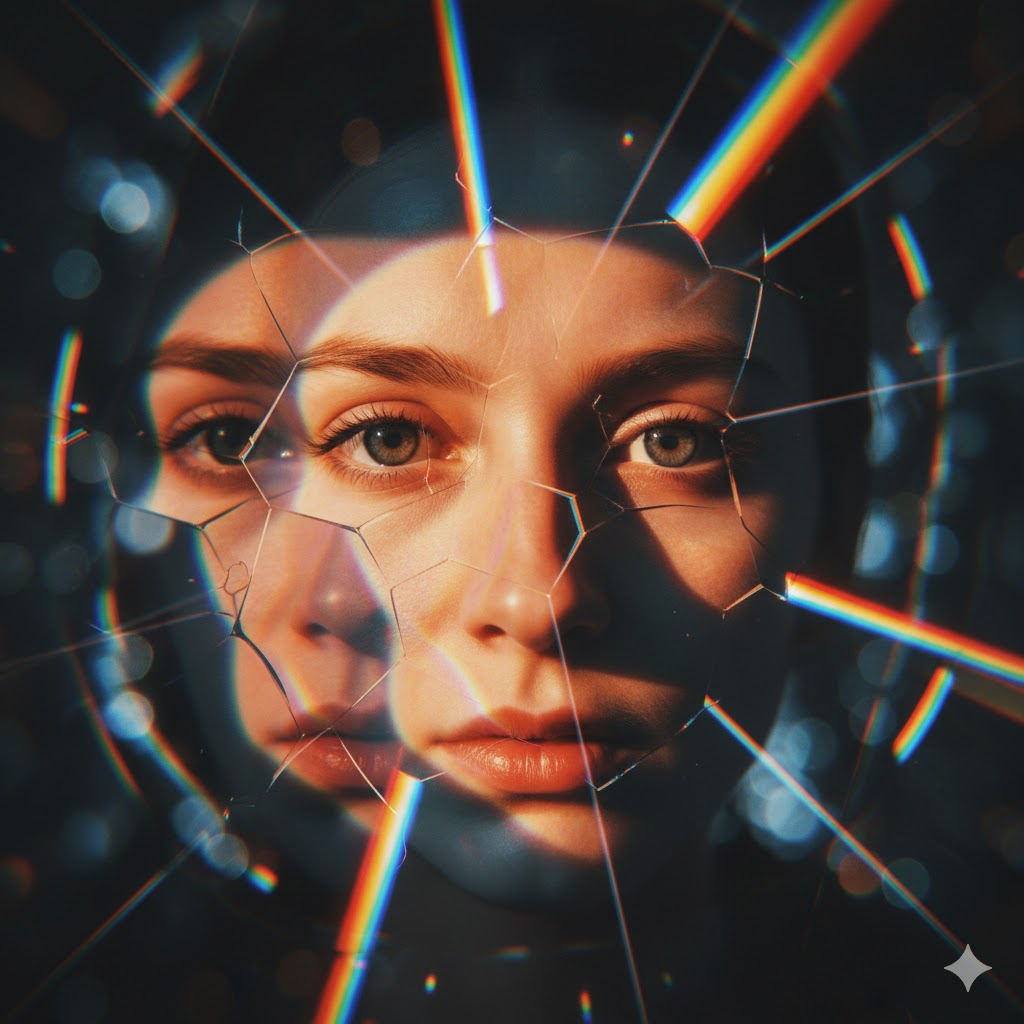 Prism-induced color splits and geometric distortions create a fine-art surreal look.