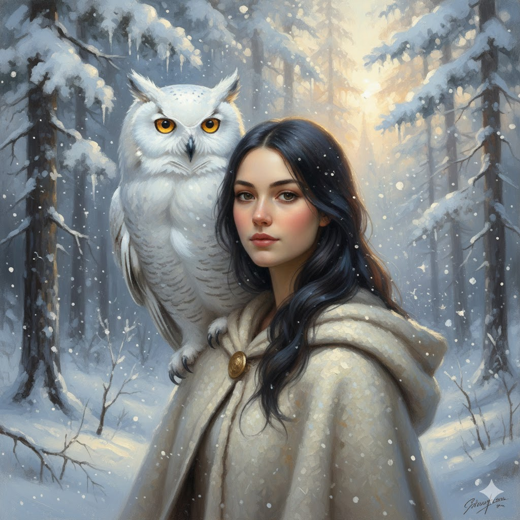 A painterly portrait with a majestic white owl and winter light aesthetics.