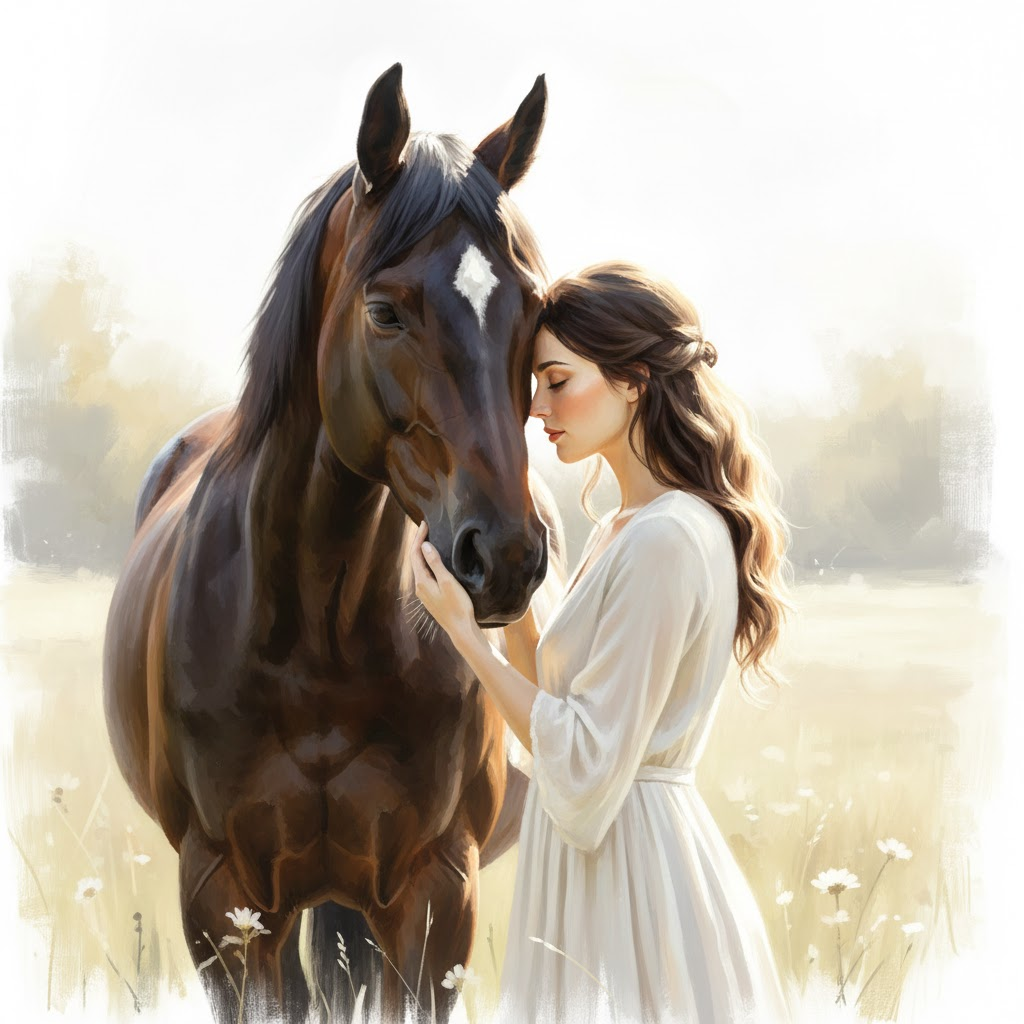 A tender, emotional high-key portrait with the close presence of a dark brown horse.