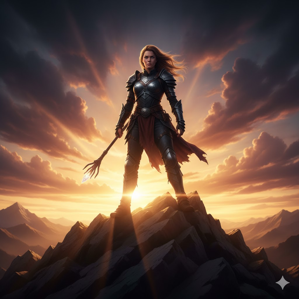 A powerful portrait shot from below with a glowing sky backdrop—strong, epic, cinematic.