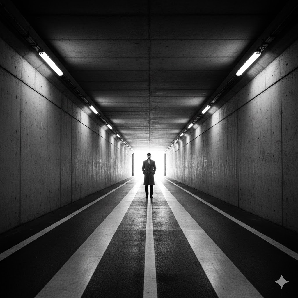 A centered portrait using tunnel lines to create striking perspective and symmetry.