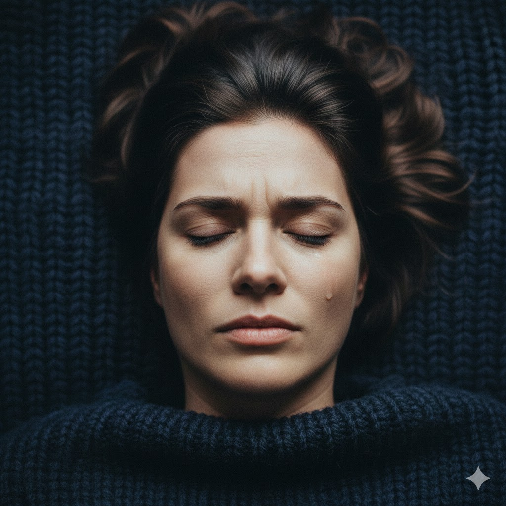 A softer, introspective portrait from above emphasizing emotion and texture.