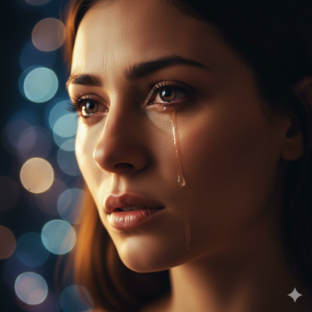 A cinematic portrait with glowing bokeh orbs and a highly detailed emotional tear.