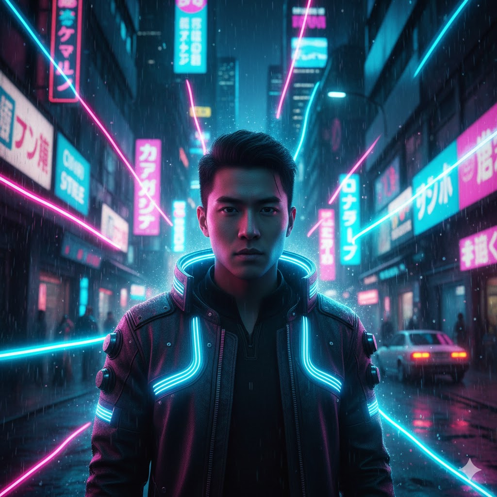 A cyberpunk-inspired portrait with neon trails and dramatic shutter drag effects.