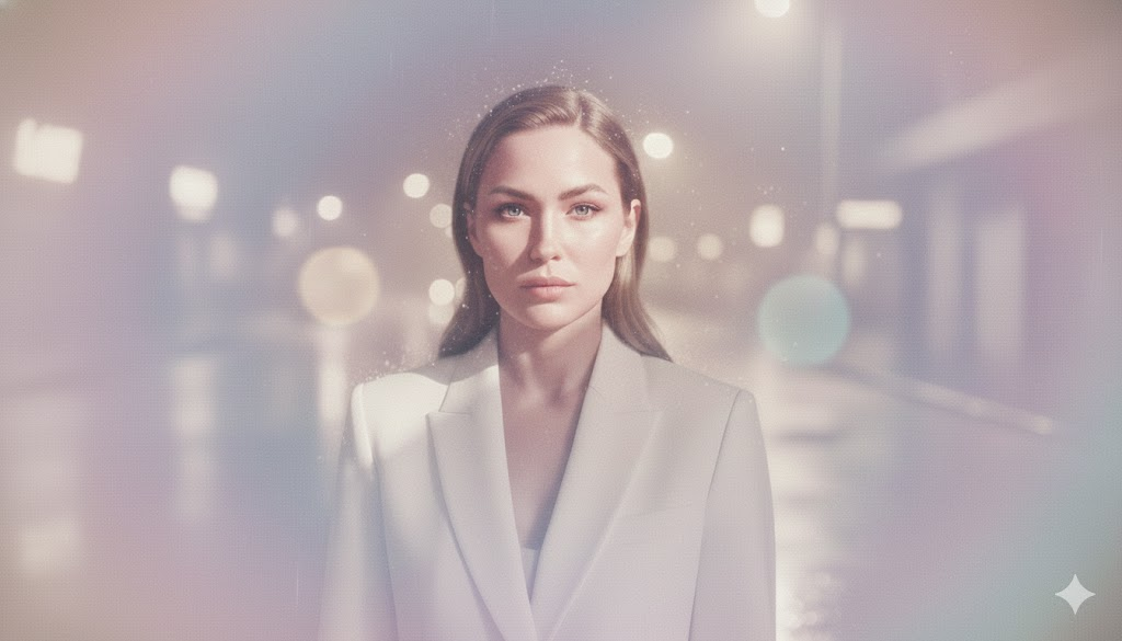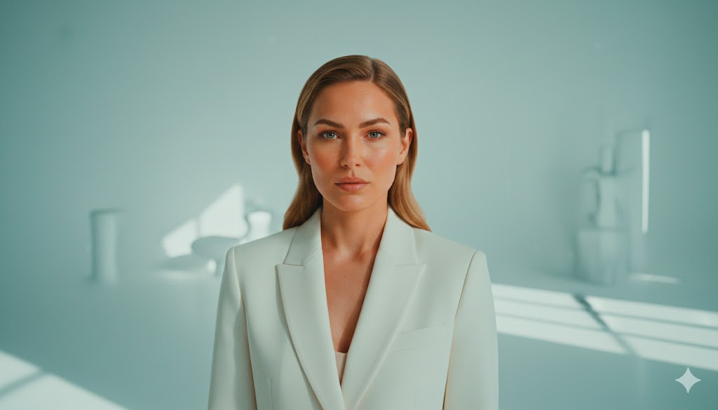 “Generate a luxury minimalist portrait with bright diffused lighting, white interiors, and high-end fashion aesthetics. Outfit: simple cream blazer. Maintain facial identity perfectly. Add soft shadows for depth.”