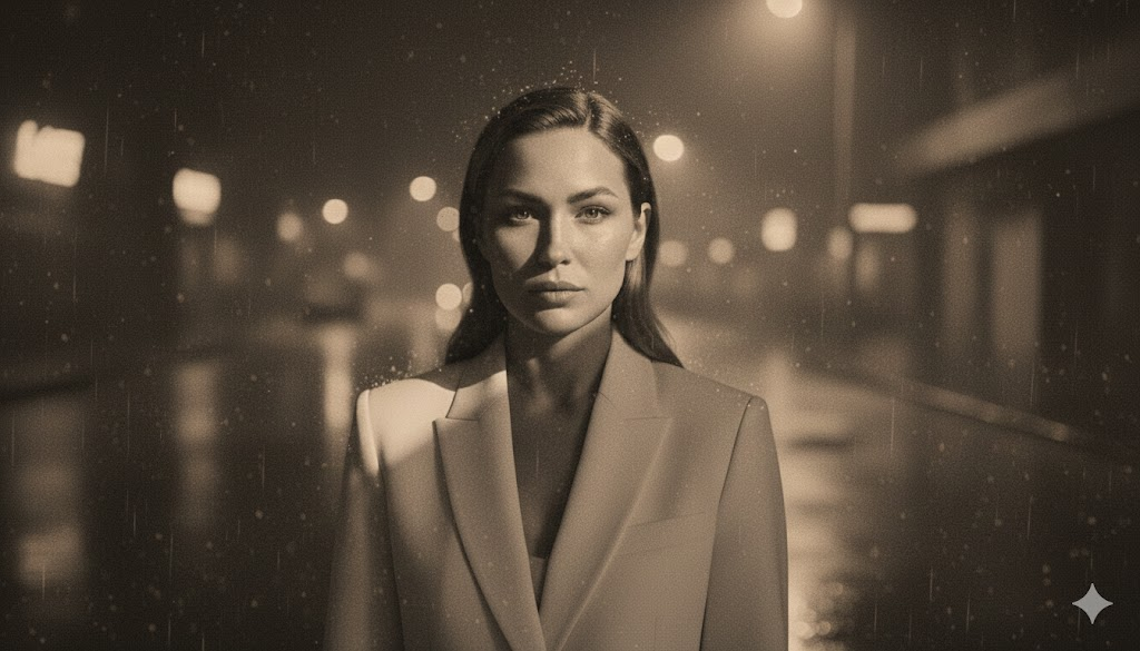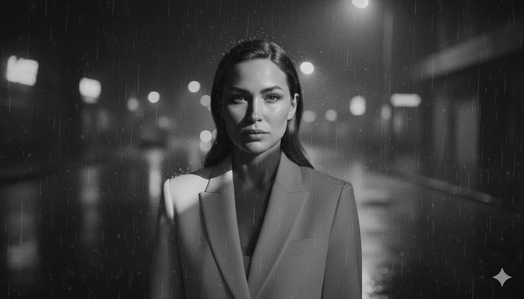 “Produce an artistic noir-inspired portrait with deep contrast, soft rim lighting, and cinematic shadows. Subtle grain for realism. Eyes remain sharp; lips and skin retain natural detail. Background: dark blurred room ambiance.”