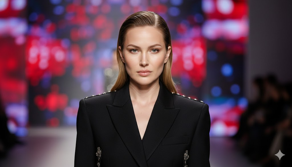 “Generate a runway-style portrait with bold lighting, precise shadows, clean skin texture, and premium fashion styling. Background: blurred runway lights. Keep face identity identical.”
