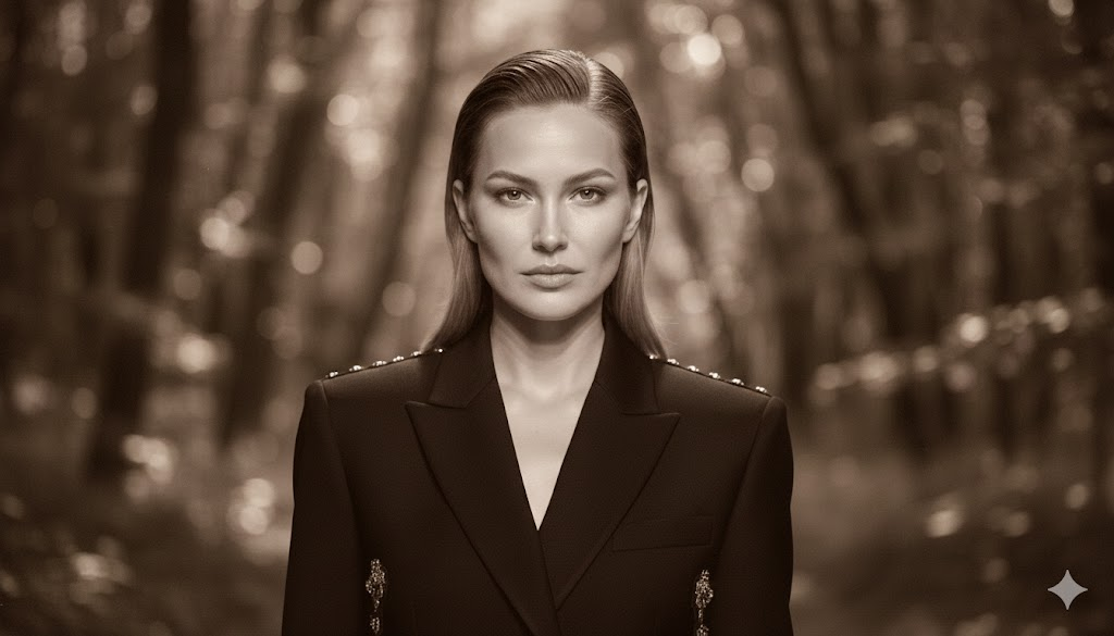 “Transform the image into a high-fashion editorial portrait with glossy lighting, rich contrast, and refined texture. Outfit becomes a sleek modern jacket. Background: matte gray studio wall. Capture a poised, confident expression with 4K photographic clarity.”