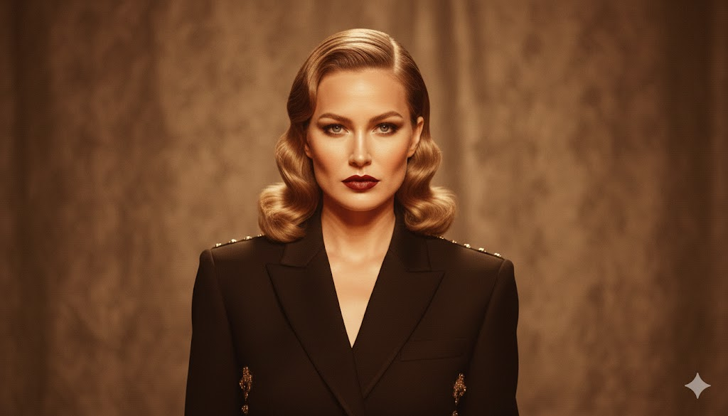 “Enhance into a Hollywood-style retro glam portrait with glossy waves, soft dramatic lighting, defined shadows, and a vintage studio background. High-end beauty magazine finish.”